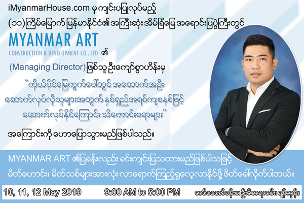 လာမယ့် (၁၀-၅-၂၀၁၉၊ ကနေ ၁၂-၅-၂၀၁၉ ) နေ့အထိ (၃)ရက်တိုင် ၊ တပ်မတော်ခန်းမမှာ ကျင်းပပြုလုပ်မယ့် (၁၁) ကြိမ်မြောက် မြန်မာနိုင်ငံ၏ အကြီးဆုံးအိမ်ခြံမြေအရောင်းပြပွဲကြီးတွင် MYANMAR ART Construction ၏ Managing Director ဖြစ်သူ ဦးကျော်စွာဟိန်းမှ ကိုယ်ပိုင်မြေကွက်ပေါ်တွင် အဆောက်အဦဆောက်လုပ်လိုသူများအတွက် နှစ်ရှည်အရစ်ကျစနစ်ဖြင့် ဆောက်လုပ်နိုင်ကြောင်း သိကောင်းစရာများ အကြောင်းကို ဟောပြောဆွေးနွေးသွားမှာဖြ စ်တဲ့အပြင် MYANMAR ART ၏ ဆောက်လုပ်ရေးဝန်ဆောင်မှုများကို ပြခန်းကျယ်ဖြင့် ခင်းကျင်းပြသသွားမည်လည်းဖြစ်ပါသဖြင့် မိတ်ဟောင်း၊ မိတ်သစ်များအားလုံး လာရောက် ကြည့် ရှုလေ့လာကြဖို့ လေးစားစွာ ဖိတ်ကြားအပ်ပါတယ်။